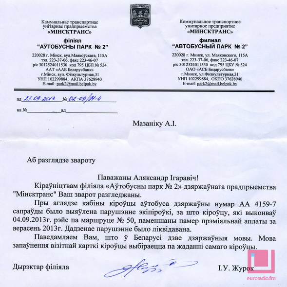 Першае, што зрабіў Мазанік, — занатаваў дзяржаўны нумар аўтобуса АА 4159-7 ды імя кіроўцы. А потым напісаў ліст у аўтобусны парк №2. Неўзабаве прыйшоў адказ. Дырэктар Ігар Журок засведчыў, што падчас праверкі “выяўлена парушэнне экіпіроўкі”, і паведаміў, што “кіроўцу паменшаны памер прэміяльнай аплаты за верасень 2013 года”. Таксама ў адказе значыцца, што “парушэнне ліквідаванае”.
