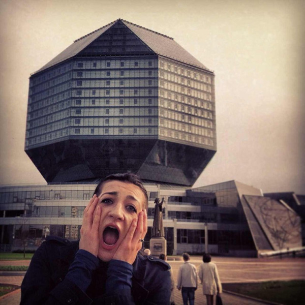 Гэта не сур’ёзны турыст-беларус, гэта больш весела і канцэптуальна. Акцёрка “Свабоднага тэатра” Юля Шаўчук фатаграфуецца на фоне мінскіх славутасцяў, капіюючы персанажа карціны “Крык” Эдварда Мунка.