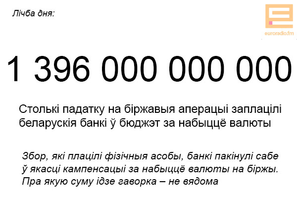 За набыццё валюты на біржы беларускія банкі заплацілі 1 трыльён 396 мільярдаў рублёў падатку на біржавыя аперацыі. Нагадаем, указам прэзідэнта ад 20 снежня 2014 года №607 быў уведзены падатак на біржавыя аперацыі па набыцці валюты ў памеры 30% ад сумы (пазней ён быў зніжаны спачатку да 20%, пасля да 10%, а 8 студзеня адменены). Гэты падатак, які ішоў у бюджэт, на біржы сплачвалі банкі, што набывалі валюту для сваіх кліентаў. За час яго існавання — з 20 снежня 2014 года па 8 студзеня 2015 года — у рэспубліканскі бюджэт паступіла 1 трыльён 396 мільярдаў 300 мільён рублёў.