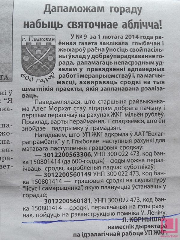Раённая газета “Веснік Глыбоччыны” абвясціла пра збор сродкаў.