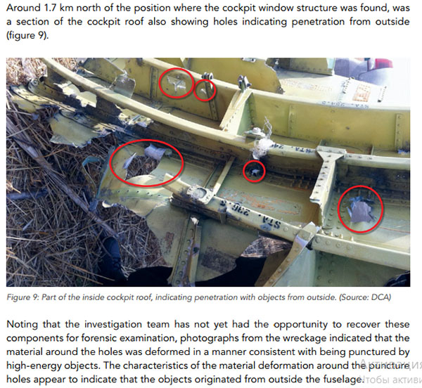 Малюнак 9: Фрагмент унутранай часткі даху кабіны экіпажу, у якой бачна пранікненне аб’ектаў звонку. (Крыніца: Дэпартамент грамадзянскай авіяцыі). Хаця следчыя яшчэ не мелі магчымасці атрымаць гэтыя кампаненты для судовай экспертызы, фатаграфіі абломкаў самалёта сведчаць пра тое, што матэрыял вакол дзіраў быў дэфармаваныя так, як звычайна дэфармуецца матэрыял вакол пранікнення высокаэнергетычных аб’ектаў. Уласцівасці гэтых дзіраў сведчаць пра тое, што гэтыя аб’екты праніклі звонку фюзеляжа.