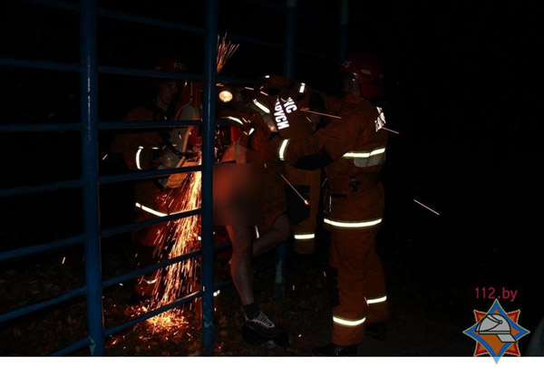 Уночы на 14 кастрычніка ў Міністэрства па наздвычайных здарэннях паступіла паведамленне пра мужчыну, якога заціснула паміж брусамі металічнай шведскай сценкі. Мужчына быў нецвярозы і абсалютна голы!