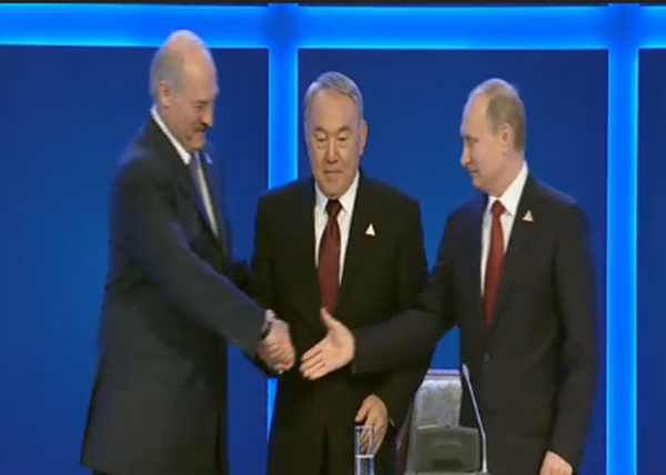 "Мы верим, что экономический союз станет основой в будущем нашего политического, военного и гуманитарного единства", — так закончил свою речь глава Беларуси. Он поздравил народы трёх стран с этим историческим событием.