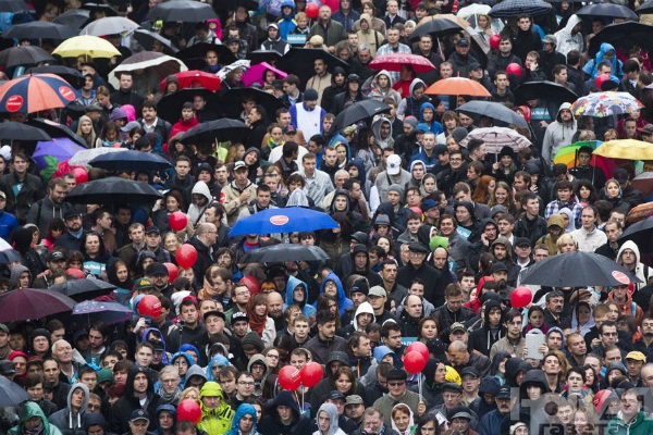 Под проливным дождем на митинг пришло несколько тысяч человек.