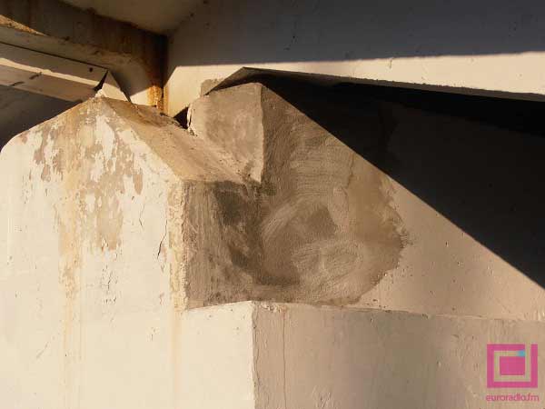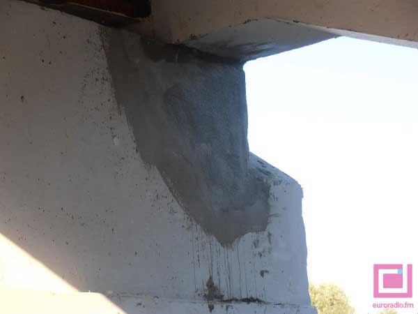Правда, никаких укрепительных приспособлений на поврежденных столбах не видно. Рабочие просто сбили растрескавшийся бетон и залепили поврежденные места цементным раствором.