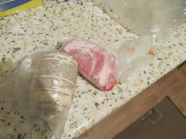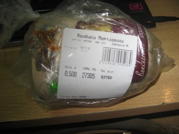 Покупаю полкило колбасы “Мортаделла” Бобруйского мясокомбината. Для верности анализа отрезаю кусочек сырого замороженного мяса, купленного на “акции щедрости” на Комаровском рынке за 63000 рублёй. Свинину замороженную купила у Минского мясокомбината.