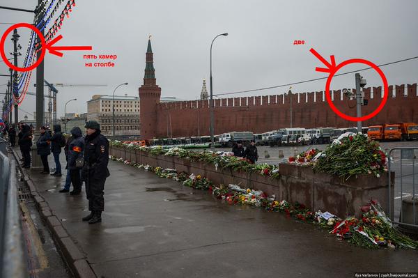 Бориса Немцова убивают на Большом Москворецким мосту — он выходит прямо на Красную площадь. До стен Кремля — десятки метров. Камер видеонаблюдения здесь буквально понатыкано, только на столбе, под которым произошло убийство, их аж пять штук. Ещё две на другом, тоже совсем рядом. Но единственная видеозапись убийства, которая пока имеется, сделана веб-камерой телеканала ТВЦ, расположенной почти в сотне метров от места происшествия. Разобрать лица на этой записи просто нереально.