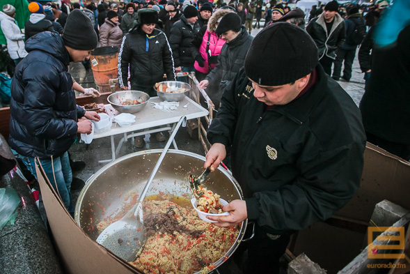 І гэтае пытанне на Майдане вырашаецца выдатна: ежу гатуюць паўсюль! Кожны можа пад'есці, нават калі ён прыехаў на Майдан без грошай.