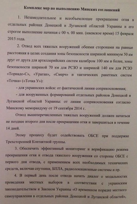 Спыніць агонь бакі павінны 15 лютага. А адвод цяжкіх узбраенняў павінен пачацца не пазней за 17 лютага.